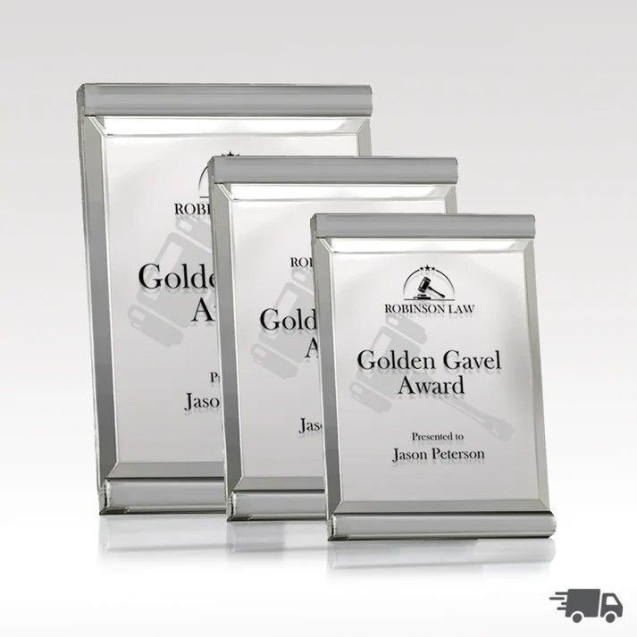 Soft, sophisticated platinum finished wood scrolls beneath a suspended glass panel to form a luxurious backdrop for your own creative etchings. The Silver Scrolls has all the attributes of awards with much higher price points. This plaque can set or hang.