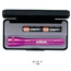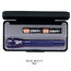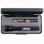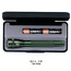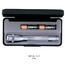 5 3/4" in length. Comes with 2 “AA” batteries and packaged in a sleek, black presentation box. Shines up to 70 times brighter than flashlights with comparable battery resources. Beam adjusts from spot to flood with the turn of the head. Converts quickly to a free standing candle mode and is water & shock resistant. Comes with a spare bulb in the tail cap. Maglite® is a USA Manufacturer.