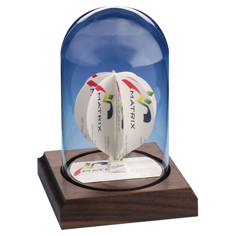 A hand crafted business card sculpture will be made from your business cards and then placed under a clear glass dome on a beautiful Walnut or Black base. Each award is individually packed for shipment.