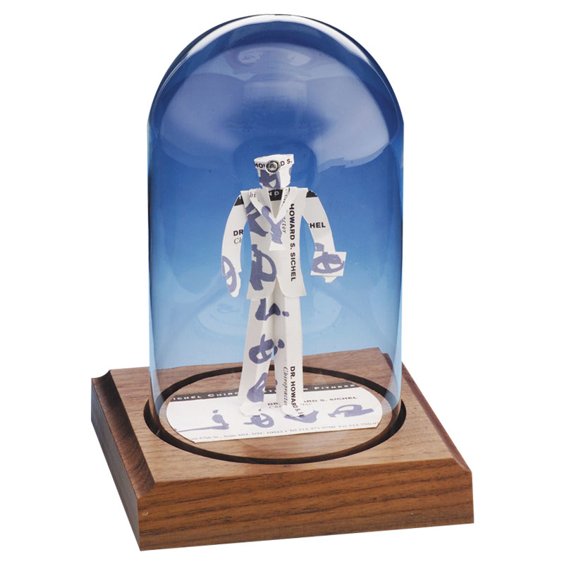 A hand crafted business card sculpture will be made from your business cards and then placed under a clear glass dome on a beautiful Walnut or Black base. Each award is individually packed for shipment.