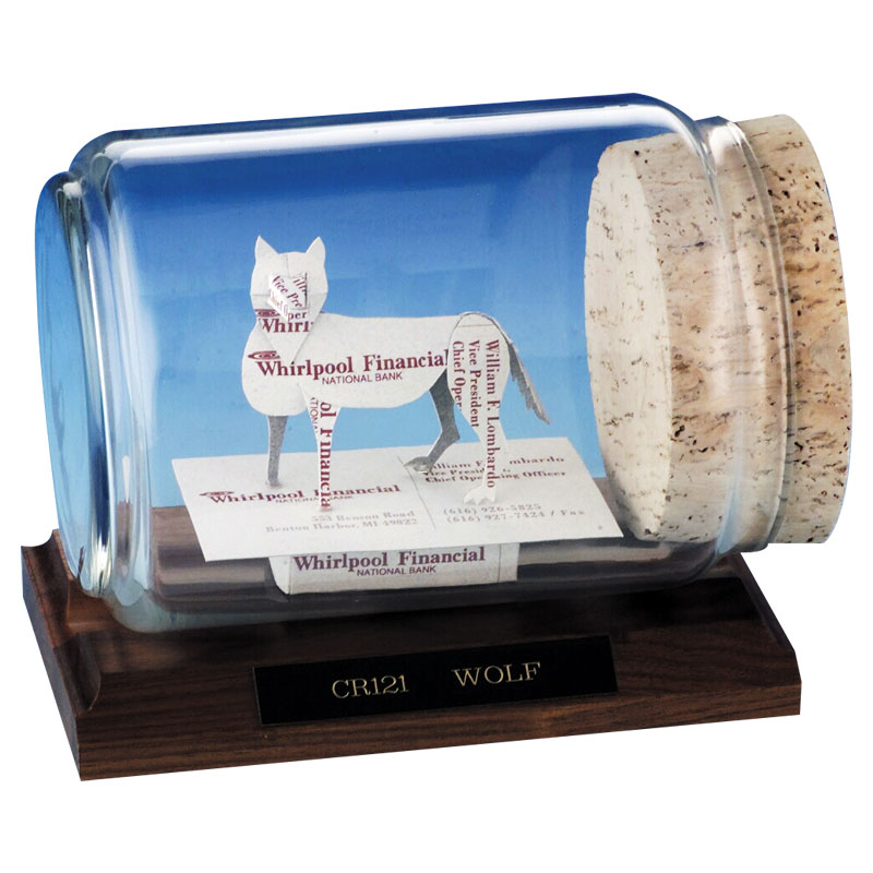 A hand crafted business card sculpture will be made from your business cards and then placed into a bottle on a beautiful Walnut or Black base. Each award is individually packed for shipment.