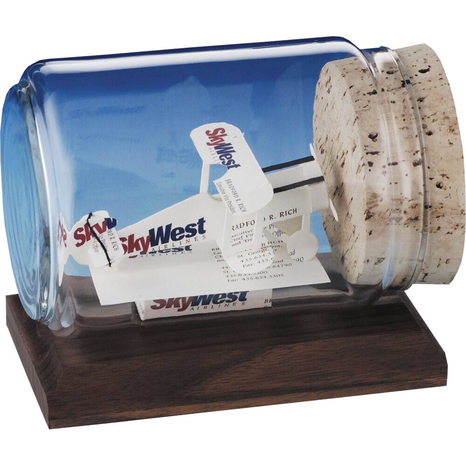A hand crafted business card sculpture will be made from your business cards and then placed into a bottle on a beautiful Walnut or Black base. Each award is individually packed for shipment.