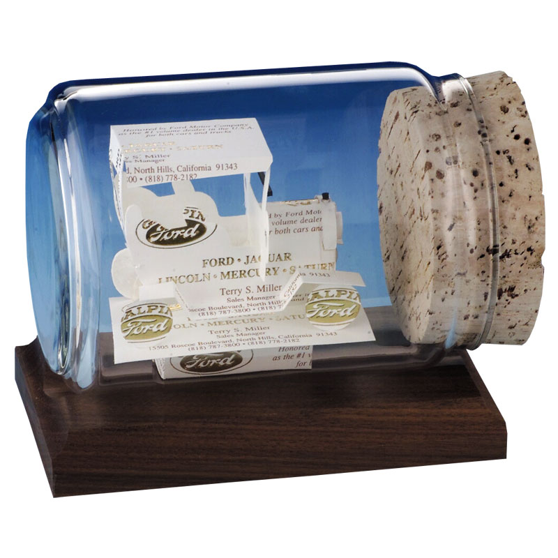 A hand crafted business card sculpture will be made from your business cards and then placed into a bottle on a beautiful Walnut or Black base. Each award is individually packed for shipment.