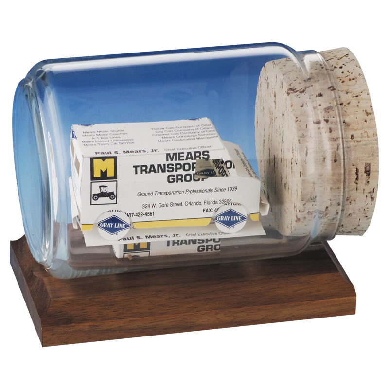 A hand crafted business card sculpture will be made from your business cards and then placed into a bottle on a beautiful Walnut or Black base. Each award is individually packed for shipment.