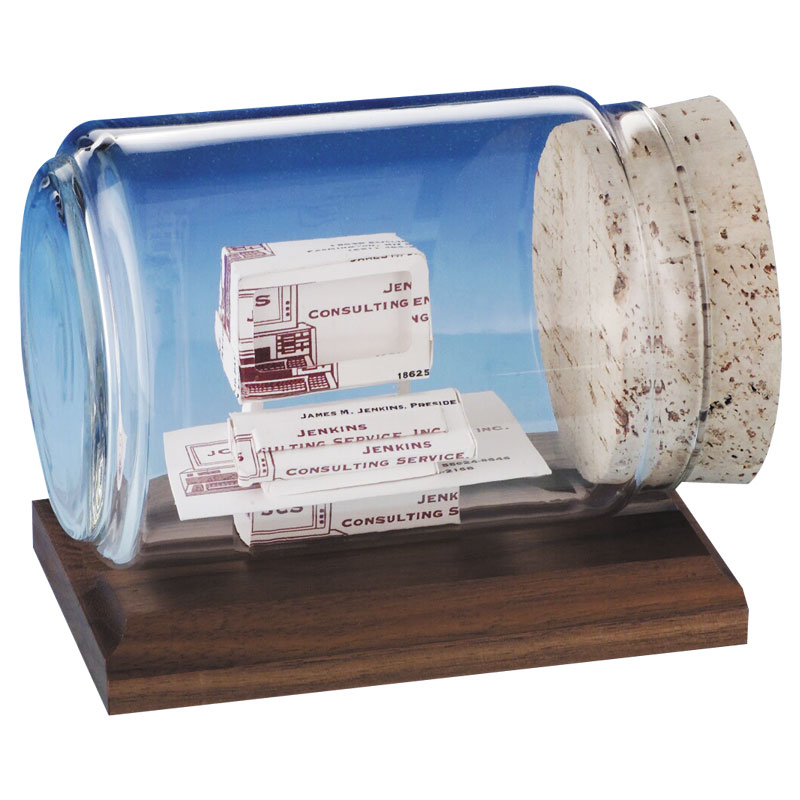 A hand crafted business card sculpture will be made from your business cards and then placed into a bottle on a beautiful Walnut or Black base. Each award is individually packed for shipment.