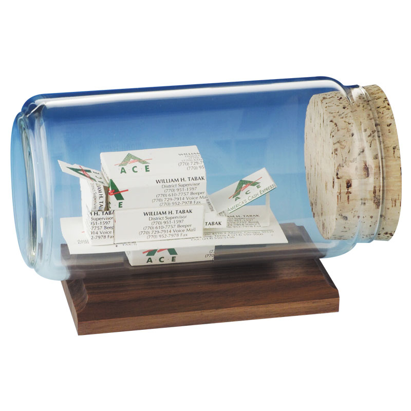 A hand crafted business card sculpture will be made from your business cards and then placed into a bottle on a beautiful Walnut or Black base. Each award is individually packed for shipment.