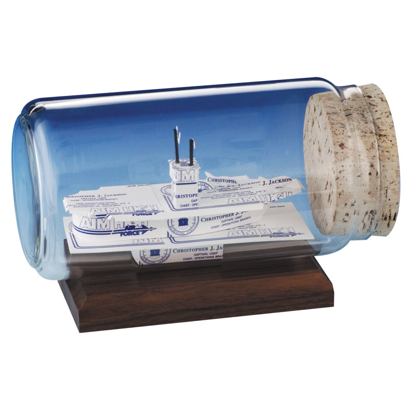 A hand crafted business card sculpture will be made from your business cards and then placed into a bottle on a beautiful Walnut or Black base. Each award is individually packed for shipment.