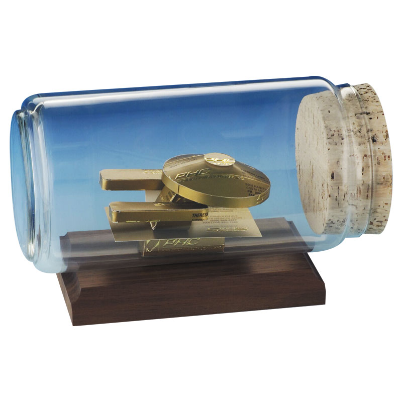 A hand crafted business card sculpture will be made from your business cards and then placed into a bottle on a beautiful Walnut or Black base. Each award is individually packed for shipment.