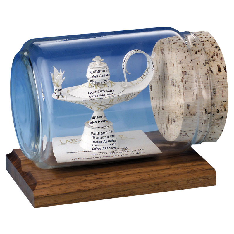 A hand crafted business card sculpture will be made from your business cards and then placed into a bottle on a beautiful Walnut or Black base. Each award is individually packed for shipment.
