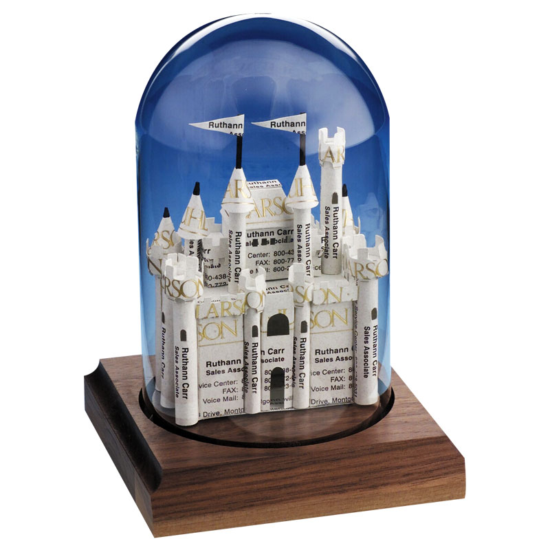 A hand crafted business card sculpture will be made from your business cards and then placed under a clear glass dome on a beautiful Walnut or Black base. Each award is individually packed for shipment.